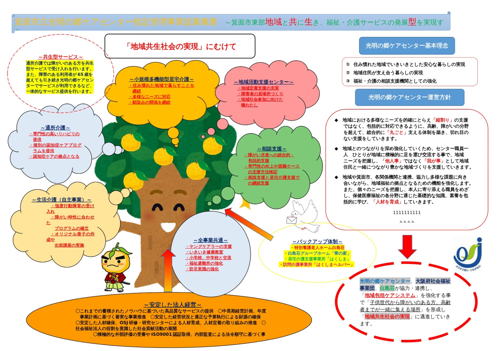 箕面市が進める地域生活支援拠点等は面的整備にて進めていくことから、東部地域については、光明の郷ケアセンターにもその大きな役割があると考えています。今後、ワークセンター小野原と光明の郷ケアセンターの運営に際し、地域で暮らす高齢者や障がいのある方が、介護や障がいの程度に関わらず、また介護や障がいの枠にとらわれる事なく支援し、地域共生社会及び障がいのある方も含めた地域包括ケアシステムの実現に寄与します。